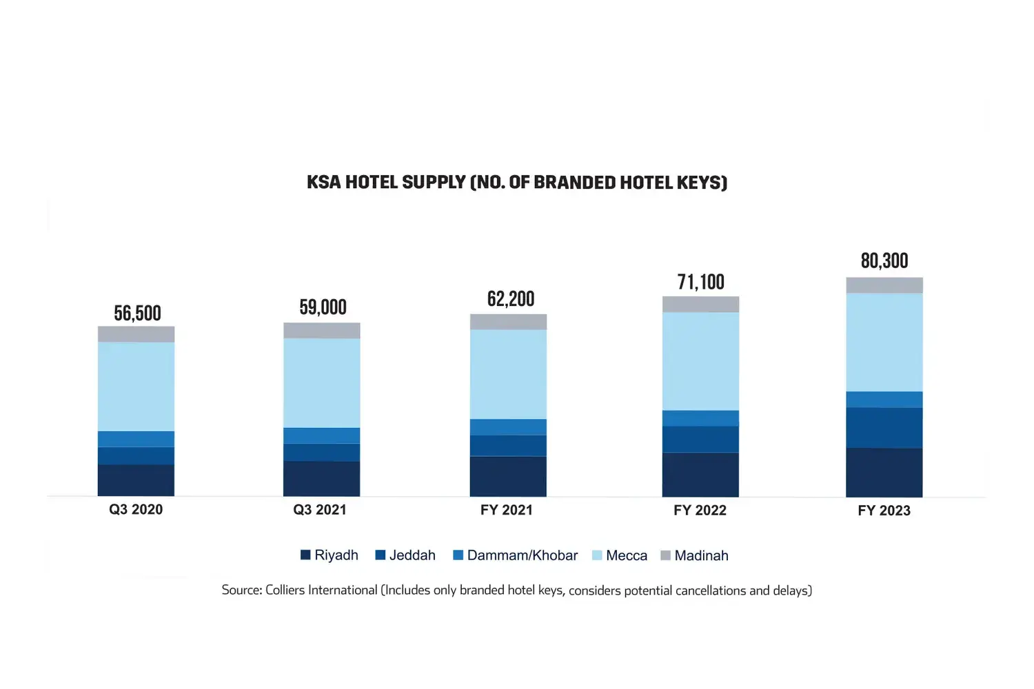 In line with this expected growth, Saudi Arabia is developing hotels at an unprecedented rate. By the end of 2023, Saudi Arabia expects to have 30% more hotel rooms online than it had at the end of 2021. The vast majority of these hotel rooms are in Makkah and Madinah, once again showcasing the strength of the religious tourism sector and its needs. Riyadh, Jeddah and Dammam – as commercial centers of the country, are also growing, with the fastest growth in hotel keys coming from the city of Jeddah within the next 24 months. With growth in tourism, comes growth in hospitality and F&B offerings, and the economics of trickling down to individual restaurant owners, taxi drivers, tourism operators and more.