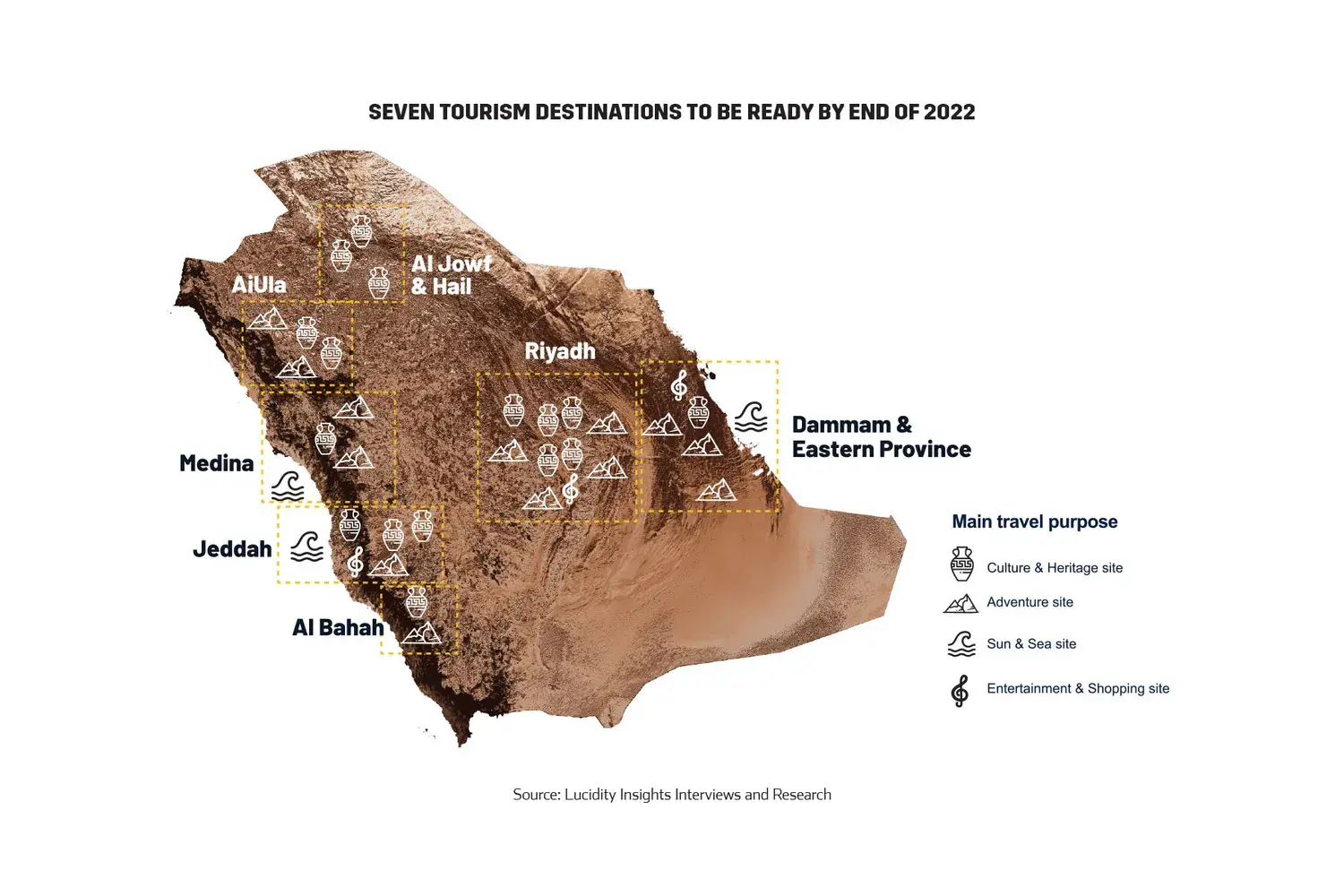 Over the past few years, in preparation for the 2019 launch of tourism visas to Saudi Arabia, 60 high potential tourism sites were identified for development, as part of a wider national tourism strategy. Many of the giga and mega-projects announced in the tourism sector over the years are developments around these high-potential tourism sites, such as Al’Ula and Qiddiya. The National Tourism Strategy also has identified over 500 complimentary tourist sites worth a detour to elevate the overall tourism experience in the Kingdom. The goal for the Kingdom is to have seven separate destinations with nearly 40 tourism sites ready for the public to pick and choose from by the end of 2022. The seven destinations focus on bringing culture and heritage offerings, adventure offerings, entertainment and shopping, as well as sun and sand relaxation offerings to tourists. The seven destinations include Riyadh, Jeddah, and Dammam – which are regular city-stops for business travelers to Saudi Arabia – and adds Medina, Al’Ula, Al Jowf & Hail, and Al Bahah regions. Visitor Centers and related infrastructure are all in development across these areas in expectation of more visitors to come.