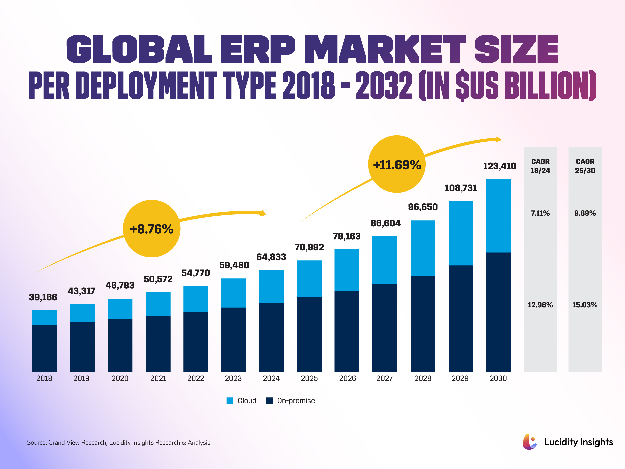 Between 2018 and 2024, the market for cloud ERP nearly doubled, achieving a CAGR of 12.96%—outpacing the growth of its on-premise counterpart. This momentum is to accelerate over the next 5 years; cloud ERP is forecasted to grow at 15.03% annually through 2030, surpassing US $47 billion by the end of the decade. While on-premise ERP will continue to expand, its growth is expected to moderate, highlighting a paradigm shift.