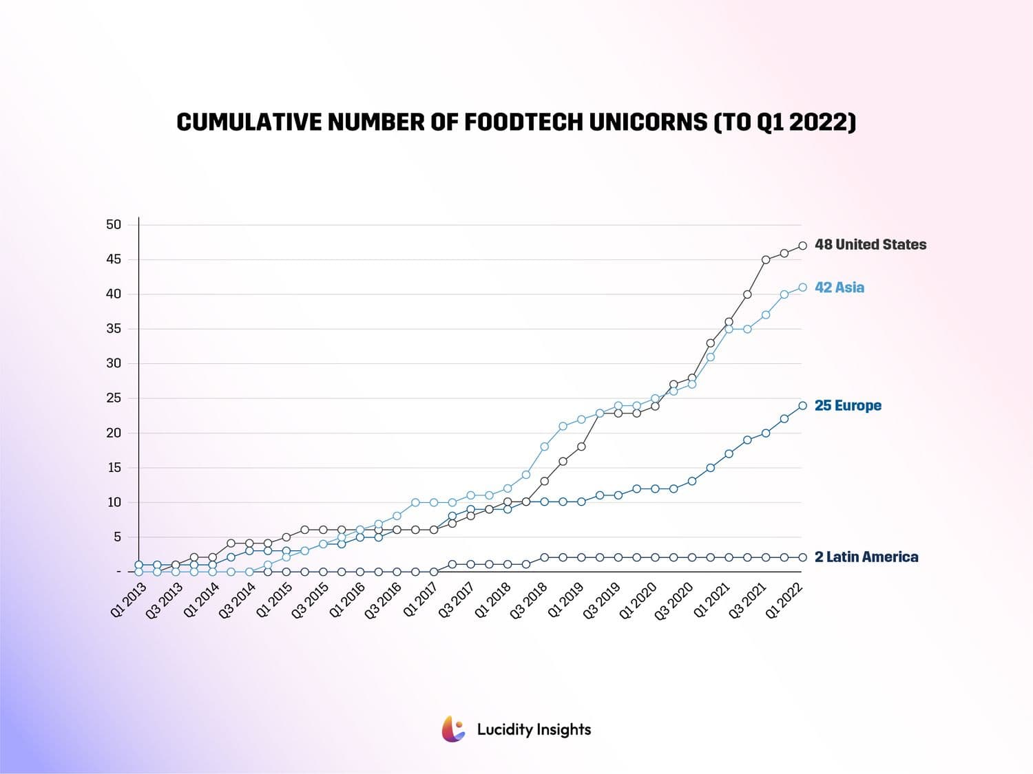 The number of unicorns has nearly doubled in the past two years; by the end of 2022, the world was home to 124 foodtech unicorns. The US and Asia are home to a disproportionate number, with 75% of all foodtech unicorns calling these markets home.