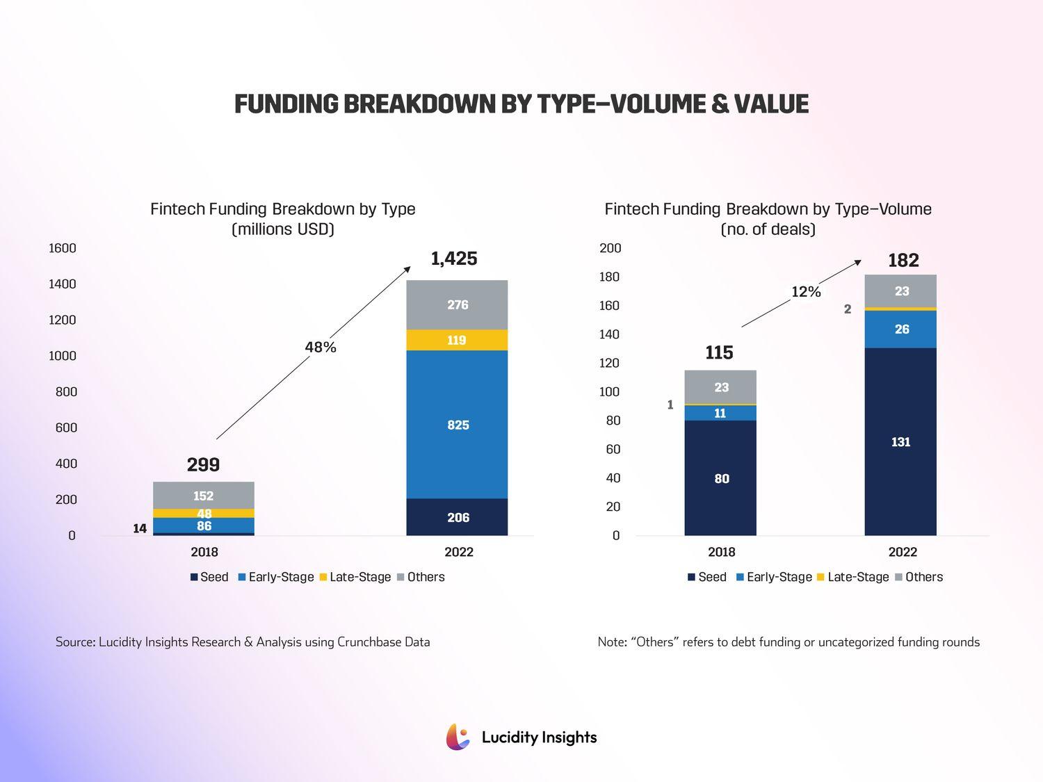 The Seed and Early-stage investments make up 72% of total fintech funds raised in 2022, and 86% of all deals inked in 2022 were with seed and early-stage fintech startups.