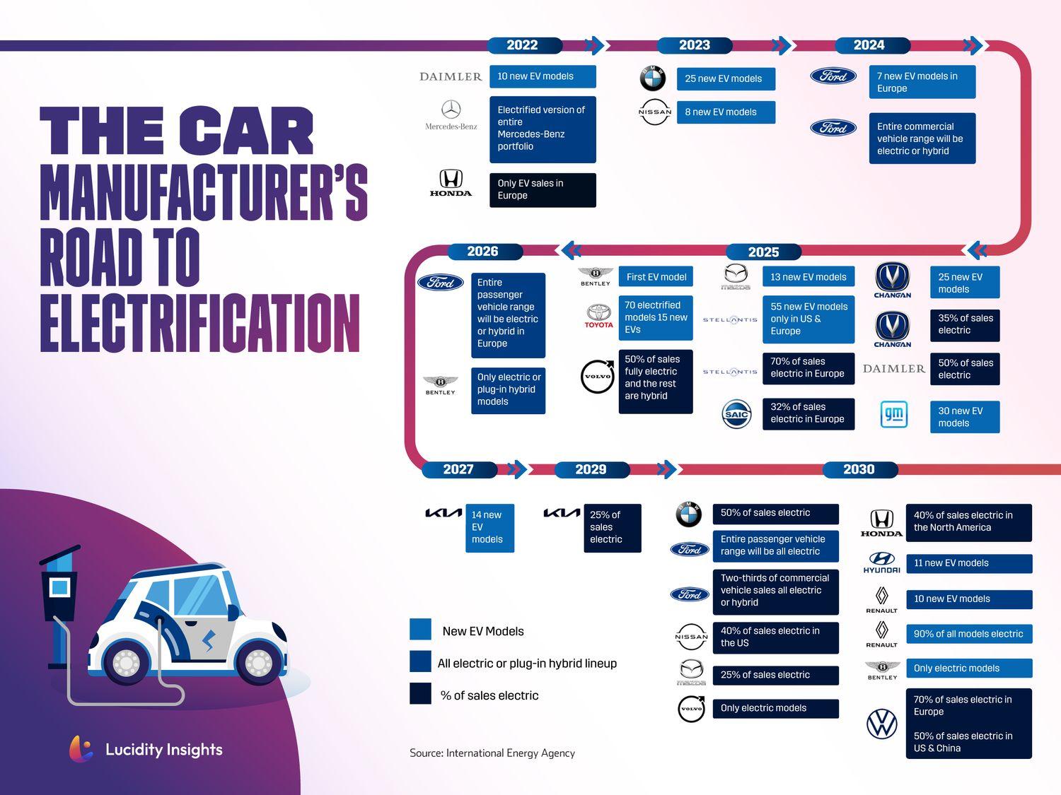 The World’s Largest Automotive Manufacturers have committed to going electric and many plan to achieve carbon neutrality by 2050, if not sooner. Here's a roadmap to all the new electric vehicle models that are slated to be launched to the public, as the world works towards a world where all cars sold, one day, will be 100% electric. At the end of 2022, there were 500 different EVs available in the world, with various degrees of availability depending on the country.