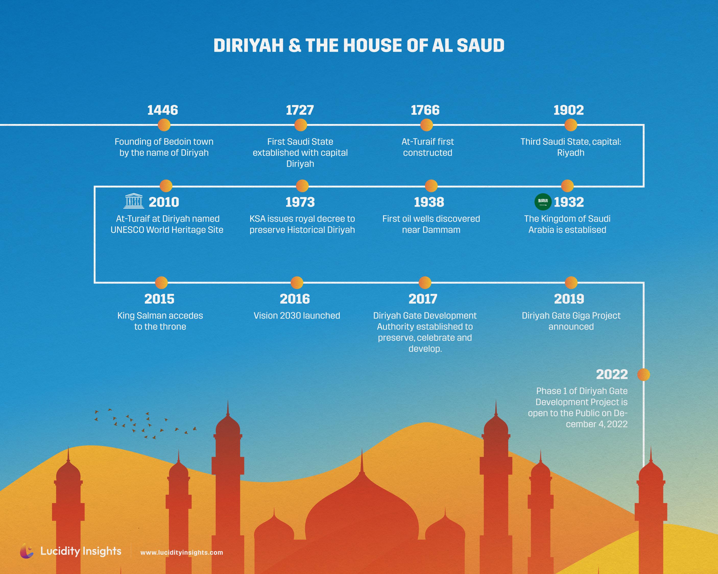 The origins of Saudi Arabia itself can be traced back to the founding of the Bedouin town of Diriyah (modern day Riyadh) by chief Mani Al Muraidi in the 15th century. Fast forward a few centuries, and Muraidi’s great great great-great grandson Abdulaziz bin Saud founded the First Saudi State, expanding his family’s reign across and beyond the Arabian Peninsula. The ruling family called themselves Al Saud, meaning the House of Saud in Arabic, a name which would stick for years to come. Later, Abdelaziz bin Abdul Rahman bin Faisal Al Saud would declare himself King of the absolute monarchy of Saudi Arabia in 1932. For nearly a century now, Abdelaziz and his many sons have ruled the Kingdom, establishing an empire whose oil, wealth, and pedigree only continue to grow alongside its history.