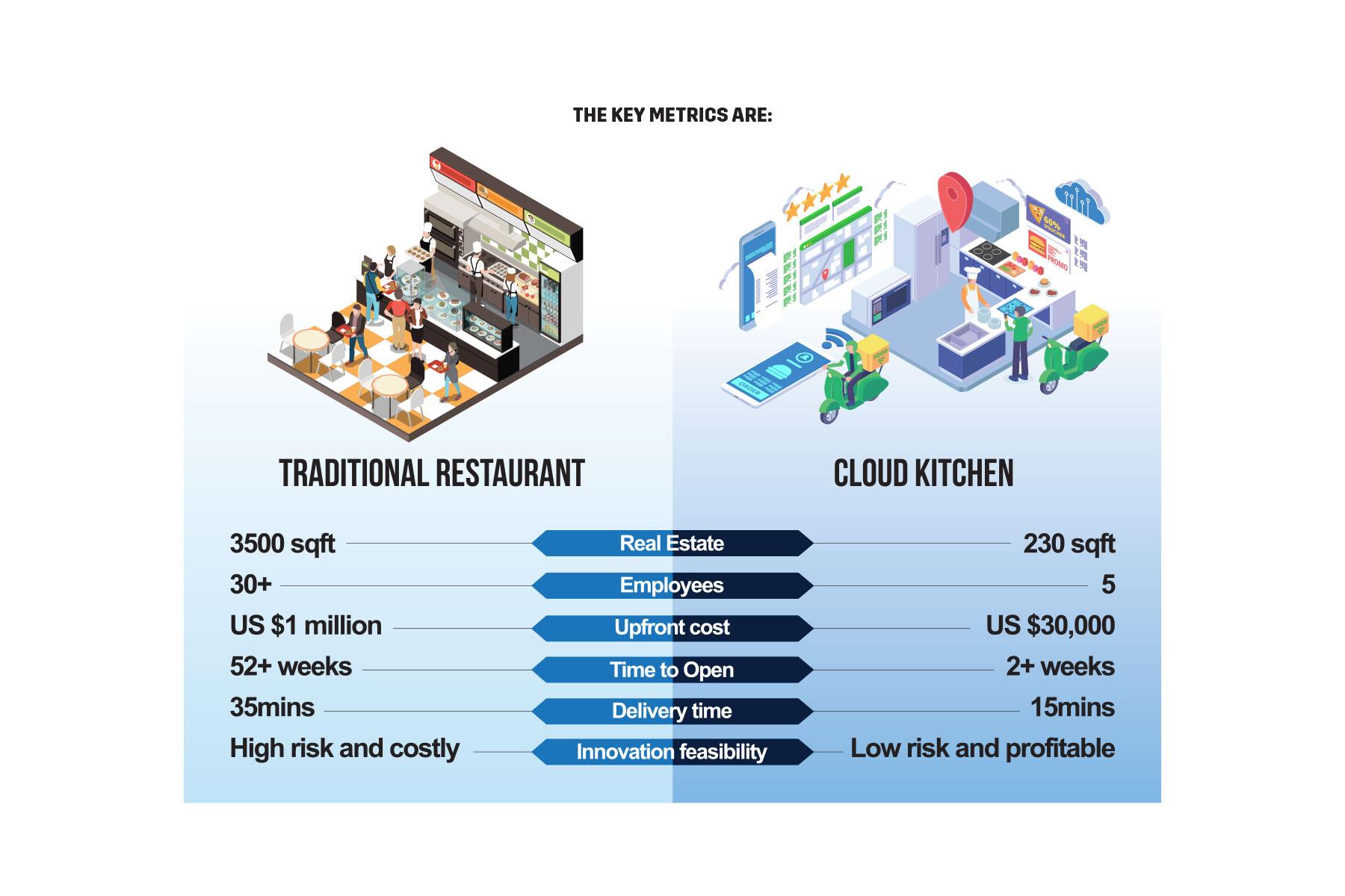 How does the set-up and operations of a cloud kitchen stack up against a traditional restaurant? Here are the top key metrics.