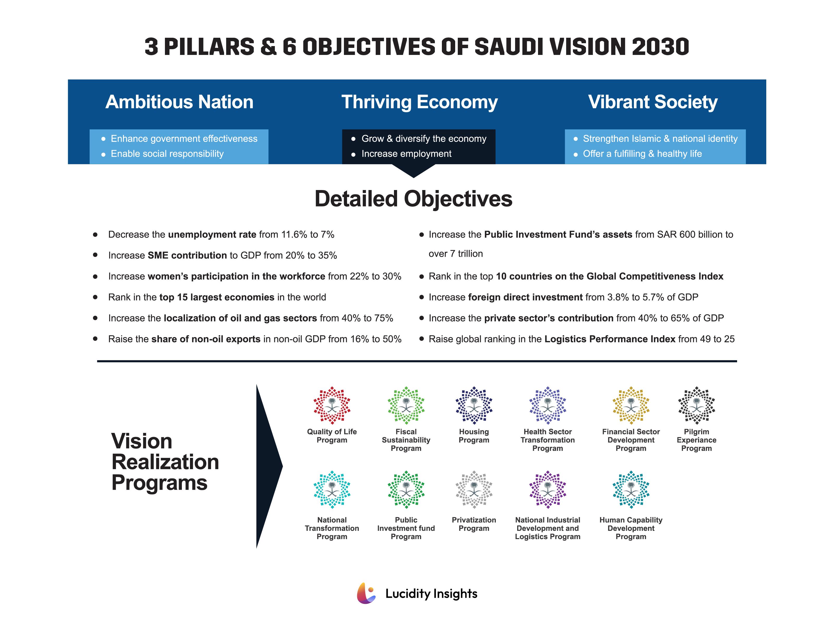 The Vision 2030 was unveiled in 2016 and is based on three pillars that would transform the Kingdom economically and socially: an ambitious nation, a thriving economy, and a vibrant society. Vision 2030’s main focus is to grow and diversify the Kingdom’s economy away from its reliance on oil revenues, increasing employment, strengthening the private sector, attracting FDI and supporting innovation.