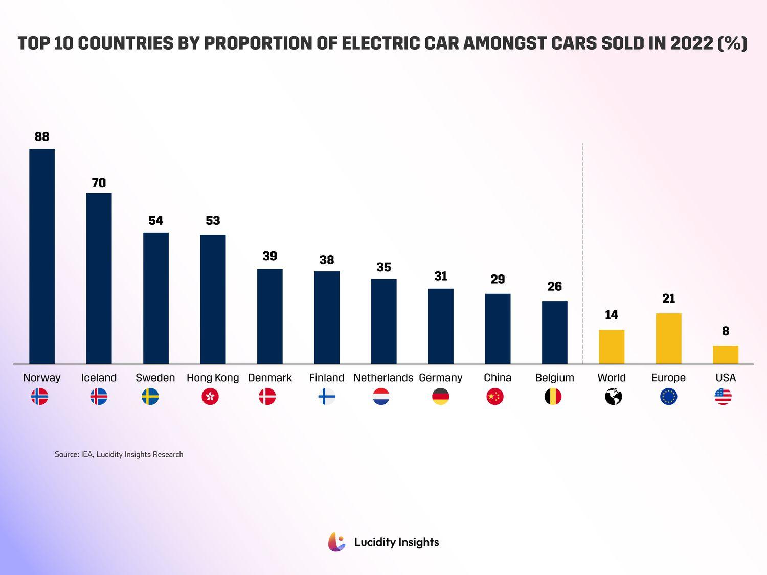 When we look at EVs as a proportion of new cars sold in 2022, small European nations lead the charge, with 88% of Norway’s total car sales being 100% electric.