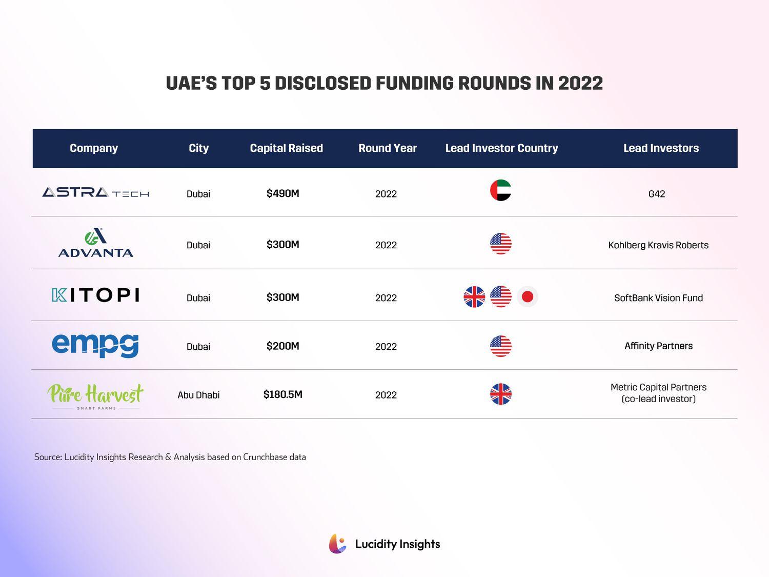 In 2022, the top four funding rounds were all from Dubai-based startups, including Astra Tech, Advanta Seeds, Kitopi, and EMPG (Dubizzle Group). The fifth came from an Abu Dhabi-based agtech startup, Pure Harvest Smart Farms.