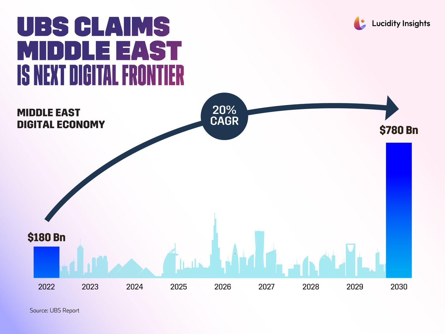Switzerland headquartered bank, UBS AG, has reported that the Middle East is expected to grow from a Digital Economy that was approximately valued at $180 billion in 2022, to more than quadruple to be valued at $780 billion by 2030. That's roughly a 20% average growth rate per year. This would make the Middle East one of the fastest growing digital economies globally, especially as the global digital economy is expected to double in that same time period.
